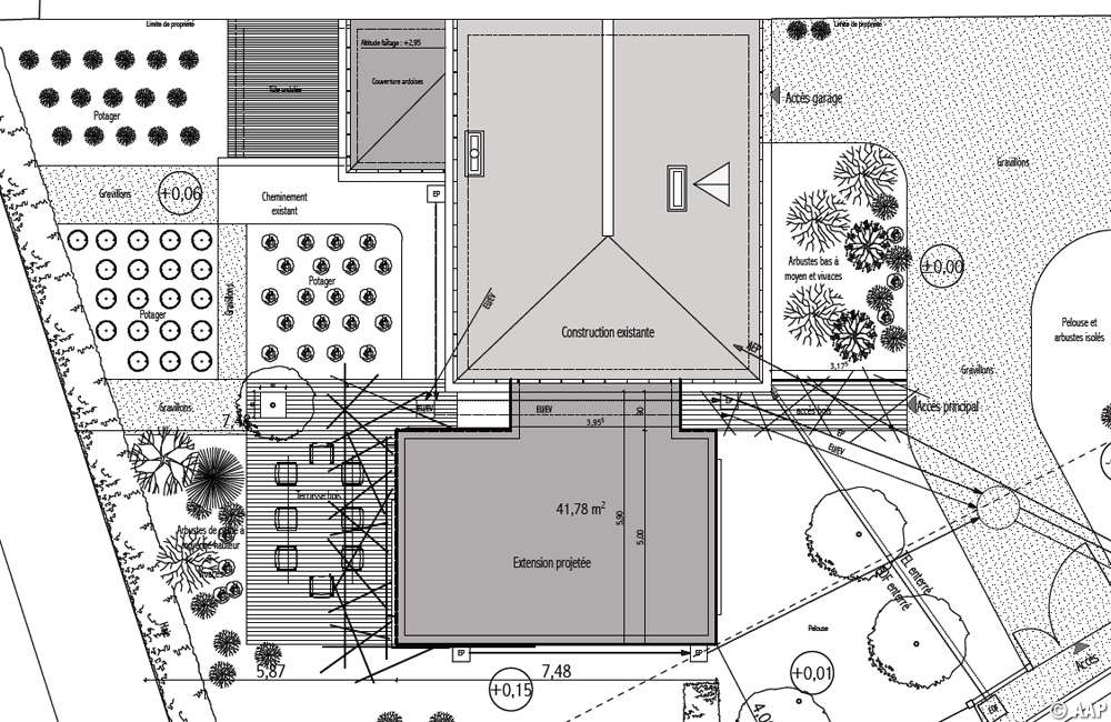 Ajout d’un grand séjour au niveau et en lien direct avec le jardin. Une nouvelle terrasse dans le prolongement de l’extension offre un espace extérieur pour la saison estivale et recompose la partie arrière du jardin en potager. En ossature et revêtement bois, l’extension s’intègre discrètement à la végétation environnante.